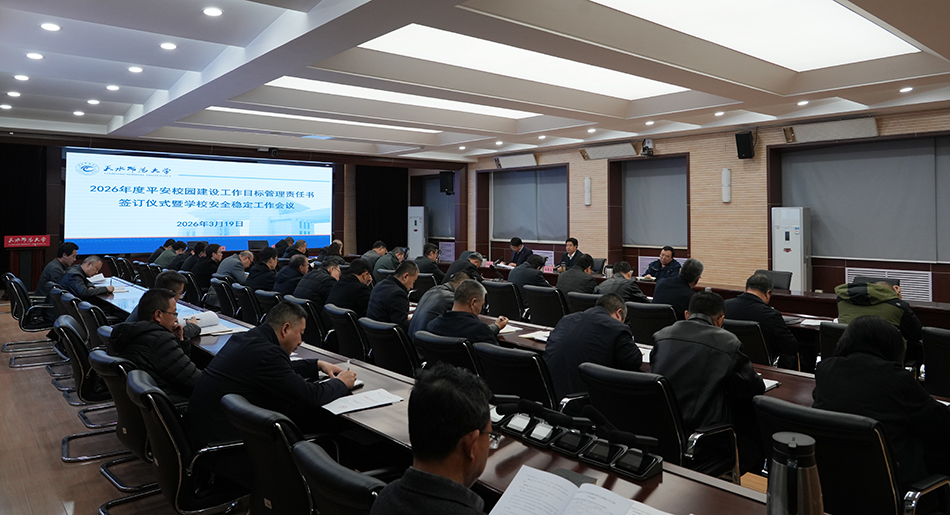 3月19日上午,学校在办公楼605会议室召开2026年度平安校园建设工作目标管理责任书签订仪式暨安全稳定工作会议。校长汪聚应,党委常委、副校长安建平,党委常委、宣传部部长、统战部部长武胜文出席会议。学校主动创稳领导小组成员单位负责人和各学院院长参加会议。会议由安建平主持。